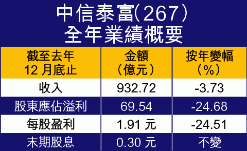 中信泰富去年度純利倒退逾兩成至69.54億元,每股盈利1.91元,末期息每股派0.3元。雖然業績遜預期,惟受工程進度明朗化帶動,股價不跌反升,全日上升7.6%至11.92元。
