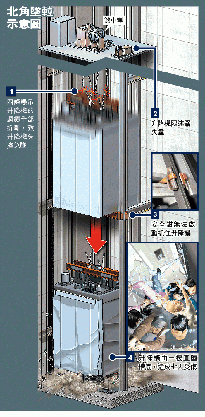 事發於前晚8時許,七人乘搭五號𨋢上一樓時突然急墜,直墮五米至槽底,被困𨋢內的七人互相擠壓及仆傷送院。