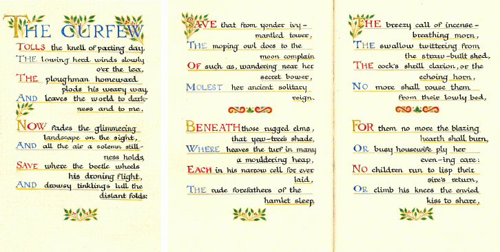 盈掌小紙片,鉛筆速寫,有的精細,有的粗獷,全是裸婦,偶有秘戲,有兩張尺寸大些,硬春宮。老威爾遜跟西弗林私交深厚,經手買賣西弗林藏書票好多年,我家一大堆都是他賣給我的。草圖他說拿得到的並不多,能勻給我的就那些了,他自己也藏了一些,也不多。老威爾遜是老實人,像學者不像書商,買賣舊書買賣藏書票說一不二,我從來不跟他議價,老朋友,他的脾氣我清楚。秋翁知交格雷姆我見過一兩次,老威爾遜介紹的,在查令十字路附近小咖啡館裏,我和老威爾遜喝茶聊天,格雷姆路過隔着玻璃窗看到了匆匆進來坐一坐。人很和氣,聽說那時候集藏法國十九世紀書籍裝幀家裝幀的舊書,也藏維廉.莫里斯凱爾姆斯特出版社出版的書。那天他說了許多法國裝幀家拉巴列爾Romain Raparlier的故事,說他做的書皮都用金屬針頭燒熱刻花,做皮畫愛在皮上先塗一層酸溶液才下刀上色,做出來的裝幀帶古銅銹紋,氣韻古雅,一九○○年四十三歲去世手藝也失傳了。格雷姆說拉巴列爾做過莫里斯出版的一些書,他珍藏幾部,還有幾部遇不到。許多年後我倒收進了一部,莫里斯撰寫和出版的《The Tale of Emperor Coustans and of Over Sea》,一八九四年初版,拉巴列爾皮裝雕製,美國著名藏書家Cortlandt F. Bishop舊藏,有他的皮製藏書印記,一生收藏精美裝幀舊書出名,一九三五年謝世。秋翁在我家見過這本書,電話告訴格雷姆。格雷姆說幾位相識書商都知道我拿了這冊拉巴列爾,問我肯不肯加潤讓給他。我捨不得。李儂說跟他交換兩百款西弗林藏書票看他肯不肯。我說西弗林我有了一百多款,都是vintage Severin,划不來。玩舊書玩裝幀年輕那些年在意的是擁有。歲數大了清賞之餘倒高興一本本補讀細讀深讀,一點不計較投資保值賺錢。難得找到稀世古董好書,玩物益智,逐頁評點,消磨永夜,那是人生暮年清趣。秋翁藏書比我早許多年,在英國寄住的時日也比我長,西洋舊書新書集存多,交換多,品類多,裝幀玩夠了他玩裝幀家美術體書寫的名篇,都寫在犢皮紙上,行裏人叫illuminated manuscript on vellum,花草設色點綴,印刷體美術字講究極了。我們住英倫那些年他集藏幾十部了,都珍稀,都漂亮,連書皮都精緻得不得了,李儂着迷偷偷找了好多年找到八九部,桑科斯基作品佔了三部。我只收藏兩部,很難再碰到了。秋翁說玩西洋古書玩到頭了才玩這些金裝手寫孤本,傳世從來不多,藝術價值高過裝幀極品。七十年代倫敦工藝學院辦展覽借過他的藏品,一位古籍專家寫序文追溯美術字手描本流源。展品中還有兩位英國藏書家的珍藏,一部對開本精緻得驚人,抄莎士比亞十四行詩,彩色繽紛,花草繁複,密美絕倫。展覽期間胡金銓正好來倫敦,我帶他去看,還有桑簡流先生,看完秋翁請我們吃午飯聊了一個下午。那年月倫敦文化生活從來豐盛。舞台劇音樂會展覽廳大大小小長年可觀可賞。書店畫廊古玩舖驚喜不斷。沒事街角小公園坐坐也舒服。愛熱鬧的夜晚泡泡酒館吹吹牛浪漫得要命。秋翁說住久了人生變得清幽,安份,隨緣:「想要的書不必苦苦追尋,」,他拿着銀杓輕輕攪一攪奶茶笑得舒適。「機緣湊泊說來就來了。」我手頭這冊《墓園輓歌》也是偶然相遇,悄然議價,欣然成交。一九一○年桑科斯基的作品,印刷體美術字錄十八世紀英國詩人格雷著名抒情詩。綠皮燙金細雕花架花卉,鑲五顆小珍珠,四顆在花架四角,一顆在花架正中孔雀石花團中央。封底和封面設計相仿。標題頁一頁素框配綠葉金枝藍字《格雷輓歌》,一頁細筆設色花果圍框,金字寫格雷及詩歌全名。格雷Thomas Gray一七五○年完成這首名詩《Elegy written in a Country Church-Yard》,全詩一百二十八行,桑科斯基在犢皮紙上抄成十七頁。紅色藍色黑色描字母,燙金欄,每節四行,隔句押韻,用描金綠葉紅花分隔。格雷是浪漫主義運動先驅,家境富裕而不快樂,父親生性粗暴,母親一生受苦,兄弟姐妹十二個死了十一個,剩格雷一個活到五十五歲。伊頓畢業,劍橋進修。我從中學到大學課堂上讀《墓園輓歌》讀了好幾次。借讚頌卑微淳樸農民的墓園闡釋貴賤終須入土的老調,意象細膩,措詞古典。一位英國牧師告訴我說全詩通俗中經營寧靜,平凡中雕琢哲思,難怪詩人反反覆覆修改了好幾年才定稿。格雷一七五七年拒封桂冠詩人。晚年情緒沮喪,作品晦澀,頻受批評,轉而研究植物學與古文物,足不出戶,憂鬱而逝,安葬在白金漢郡鄉村教堂墓園。這冊美術字書寫本流落加州,我收到賣方電郵影象傳給秋翁和李儂先看。秋翁說四五十年前他在英國藏書雜誌上見過,好像是藏書家Albert Henry Wiggin藏品,歐洲世家接過去收藏:「你先要來玩玩,玩膩了賣給我。」李儂看了還是那句老話:「你不要我要!」我們這一代人歲數都大了,瞧得上眼的東西不多,瞧上了出手也小氣,總要一兩位懂行的知交掌一掌眼才放心。十二月尾我到南洋秋翁正好跟英國書商在電郵上議價,說是沃爾浦爾Horace Walpole的《奧特朗托堡》,一七六四年初版,札納朵夫裝幀,書脊褪色褪得厲害,封面封底品相尚佳,買賣雙方在七折和八折之間拉鋸。沃爾浦爾跟格雷是老同學,一七三九年兩人結伴遊歷法國意大利,半途吵架,一七四一年各自回國,一七四五年修好,格雷許多詩作初稿都先寄給他過目。沃爾浦爾比格雷長壽,活到八十歲,著述也多,傳世三千多封書信集有名極了,李儂有,我沒有,舊書店裏遇不到。李儂說秋翁逛書店怕累,怕冷,這趟在倫敦看他