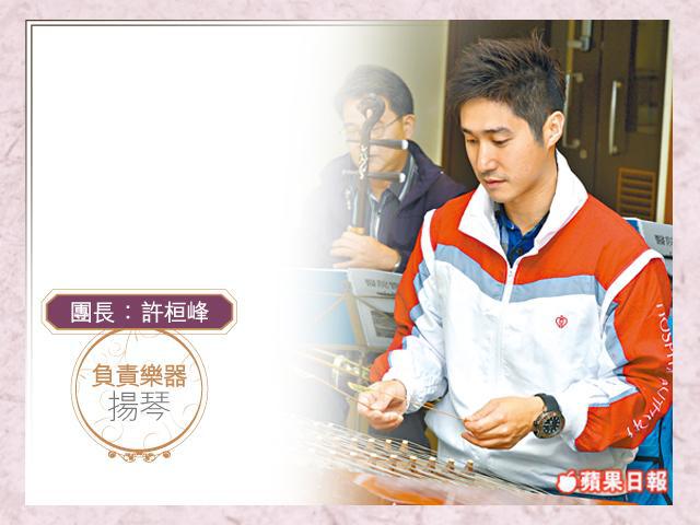 中學時代已開始學揚琴的許桓峰,讀大學時亦有參加樂團,06年在醫院裏看見中樂團的宣傳海報後,就直接打電話給雷棣華要求加入成為一分子。兩年前,他想到與青山醫院合作,研究音樂治療,以中樂結合言語治療為病人治病,「老人家對中樂特別有親切感,音樂可以令一些長期住院,感覺被isolate的公公婆婆得到關懷,這是坊間其他樂團都做不到的,也是我們樂團的最大賣點」。