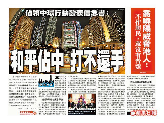 所謂「佔領中環」,我們能歸類為「政制改革」類新聞,再放入百子櫃的最底一格,貼上「注意慎用:票房毒藥」的標籤。對於本身已經是票房毒藥的兩份「黨報」來說,喬老爺當然要佔據頭條,而主流報章之中,只有兩份拿佔領中環作頭版,也不意外。另外還真的有兩份免費報,以「大學生搵着數」為標題,吸引八卦街坊取閱、廢紙回收商收納。面不紅氣不喘,勇氣可嘉。