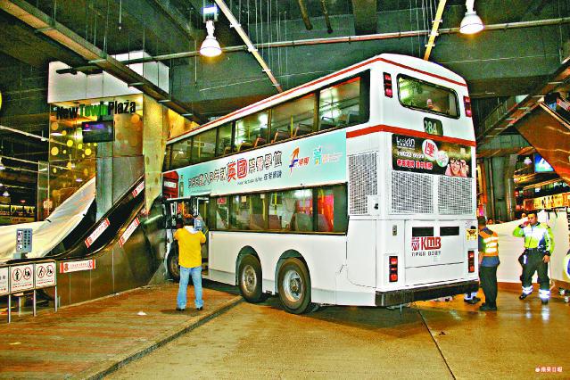 【本報訊】沙田新城市廣場地下巴士總站昨發生驚險車禍,一輛無載客的雙層巴士埋站時失控,鏟上行人路掃毀欄杆,猛撼一條扶手電梯梯壁始停下,意外中巴士車長及一名男途人受傷,要送院治療。