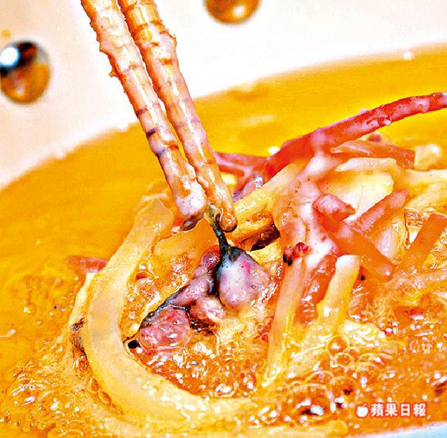 3.油加熱至170℃至180℃。用木杓盛滿蔬菜麵糊,將各蔬菜絲整理平均,推進熱油內炸。用筷子將散出來的蔬菜絲堆回中間,盡量保持形狀。
