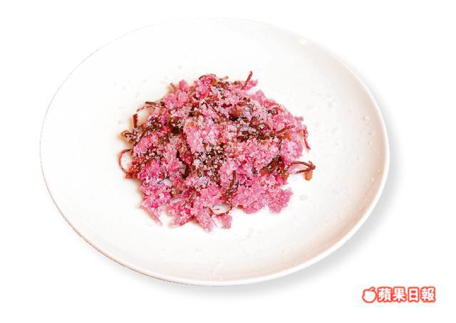 鹽漬櫻花14朵、薩摩芋96克、寒天粉4克、水500毫升、糖粉60克、拔蘭地少許