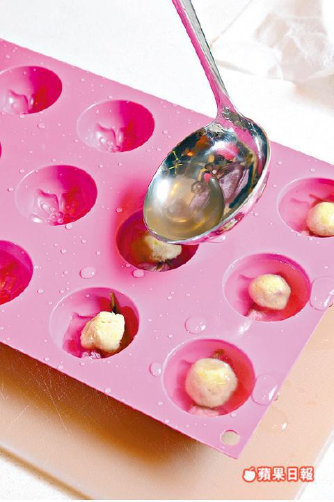 4.櫻花形矽膠模具濕水,放入一朵櫻花和薩摩芋球,注入寒天液,待室溫自然凝固後便可倒出上碟。