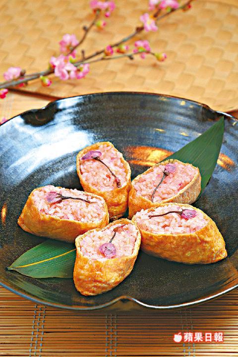 3.將飯加入醋和糖拌勻成壽司飯,放涼。雙手濕水,將飯搓成橢圓形壽司狀填入腐皮內,加上櫻花便成。