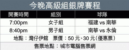 【本報訊】高級組銀牌男子籃球賽今晚上演冠軍戰,戲碼依舊是由兩支傳統勁旅南華和永倫對壘;球賽將移師至「大場」灣仔伊利沙伯體育館,為球員和球迷都帶來新鮮感,料3,000個座位會全部爆滿。