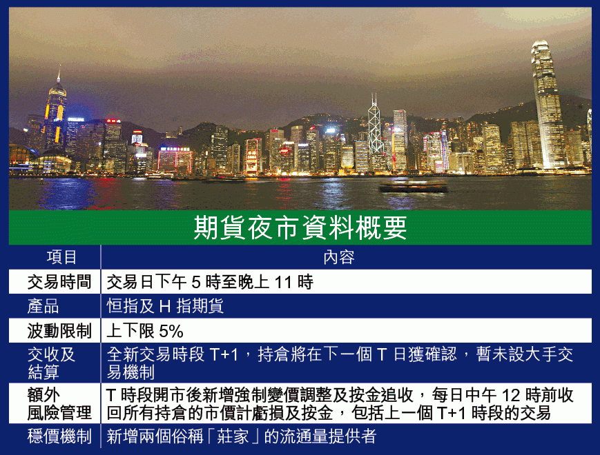 俗稱夜期的期貨夜市,首階段的產品只限恒指及H指期貨,交易時間為交易日下午5時至晚上11時(見表)。交易所指,目前期交所參與者有183間,當中80間早設有夜間交易櫃台,表明參與夜期業務的公司有110間,意味逾30間證券行會為夜期新增夜市。