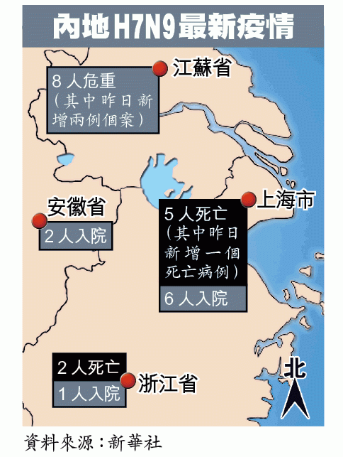 上海昨新增一宗病例,一名64歲姓賀的退休男子,本月1日出現畏寒,自行服藥後未有改善,兩日後發高燒入院,前日不治去世,當局事後採其樣本進行檢驗,證實感染H7N9禽流感。與此同時,江蘇省昨亦確診兩宗H7N9禽流感病例,病者分別是住在南京的85歲男子及住在鎮江的25歲女子,目前兩人均在醫院留醫,病情危重。