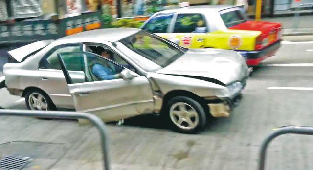 私家車瘋狂掃歪路邊20米倒U型鐵欄企圖鏟上行人路不遂,司機多次車前倒後撞開紅色小巴、七人車和貨車,致車尾玻璃爆裂,泵把飛脫,司機旁車門彈開。此際,交通警已駕鐵馬追至,喝令戴鴨舌帽、年約20至30歲司機熄匙落車。