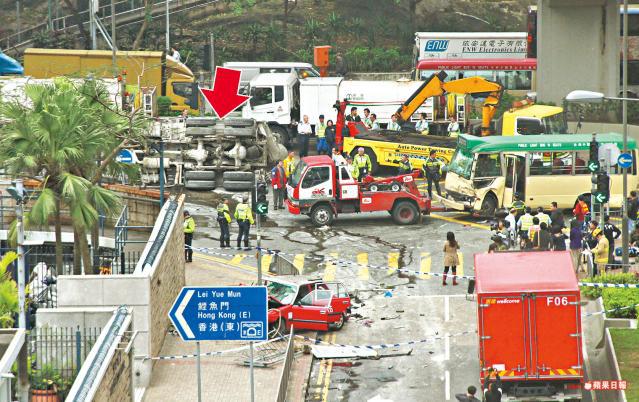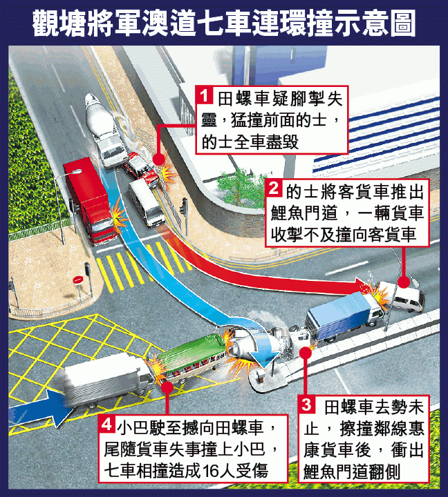 昨中午近12時,姓劉(28歲)男子駕駛一輛載滿混凝土的田螺車,沿將軍澳道落山,其間他突感迫力失靈,砰一聲撞到前面等候轉燈的士,的士失控向前衝,再撞到前面客貨車,客貨車被推出鯉魚門道,一輛貨車沿鯉魚門道駛至收掣不及,直撼飆出的客貨車。