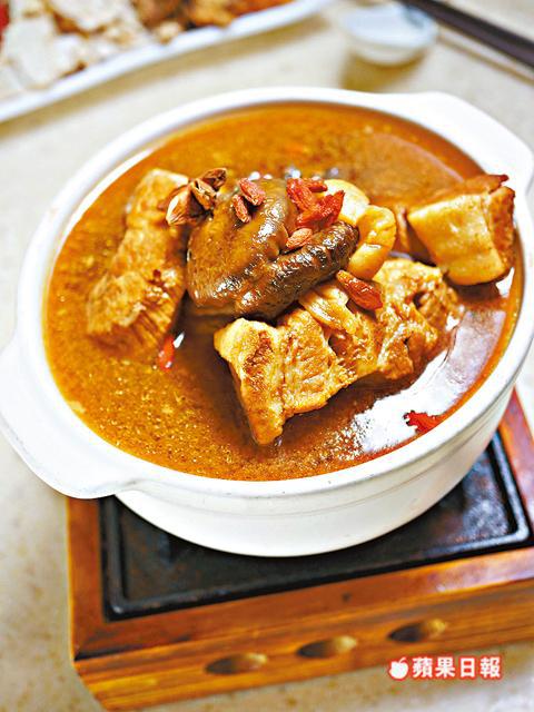 黑胡椒炒蟹是直接將越南肉蟹由生炒至半熟,再下黑胡椒、牛油、乾葱、蒜頭等,有別於先走油才炒,除了較健康外,蟹肉更入味,胡椒滲入蟹肉中,更鮮甜美味。中醫學認為胡椒具溫中健脾功效,尤適合胃寒人士。若胃口長期欠佳、食慾不振,不妨喝一碗肉骨茶補身。此店提供的肉骨茶為福建系,用淮山、當歸、八角等十多種藥材煲成,胡椒味較少,濃郁甜味,既可藥用又可飽肚。彭明慧說,肉骨茶有行血活血,滋補強身、調整體質及增強體力的功效,但當中選材性偏溫燥,所以血壓高、心血管病患者及身體燥熱人士須慎服。