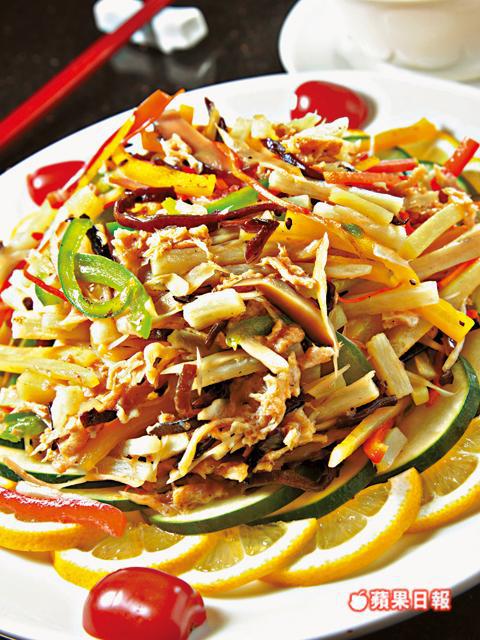 要食素菜祛濕,老闆首推「五氣朝元」,用鮮淮山、松草花、木耳、鮮牛蒡及薯仔快炒而成,以保留食物營養。鮮牛蒡早於《本草綱目》已有食用的記載,它有通便、排毒、祛濕、養顏的功效。若然胃口欠佳,橙花骨及焗鮮荷葉飯亦是不錯選擇,前者利用橙皮炒成,有天然果香,味道稍甜,而後者則用瑞士汁及蠔油炒飯,並放於新鮮荷葉內焗成,配以素蝦等配料,味道清淡而帶點荷葉香。