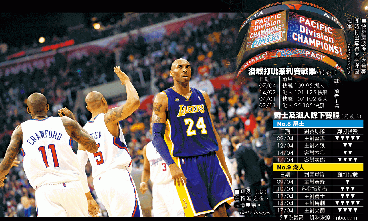 湖人雖然比爵士打少一場,但今季兩隊對賽成績稍遜(1勝2負),所以就算兩隊最終戰績一樣,爵士仍會以老8晉身季後賽。一向高傲的拜恩輸波後亦開始為季後賽擔心:「比起要贏快艇一場,現時入季後賽才是球隊最大挑戰。」湖人餘下5戰賽事比爵士嚴峻(見附表2),其中最後兩戰先後於主場鬥德州雙雄馬刺及火箭。文:利司基