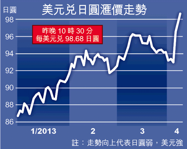 【本報綜合報道】日圓低處未算低!在市場繼續反映日本央行上周的超重手量寬措施的氣氛,圓滙昨日最多曾再跌1.5%,美元兌日圓一度升破99關,高見99.01日圓,為2009年5月以來首次。在圓滙直撲100關之際,市場關注日央行會否將措施加碼令圓滙進一步下跌,而周邊國家亦開始擔心圓滙過弱會拖累本國出口,事件令區內國家紛紛探討是否需阻止本國貨幣升值。