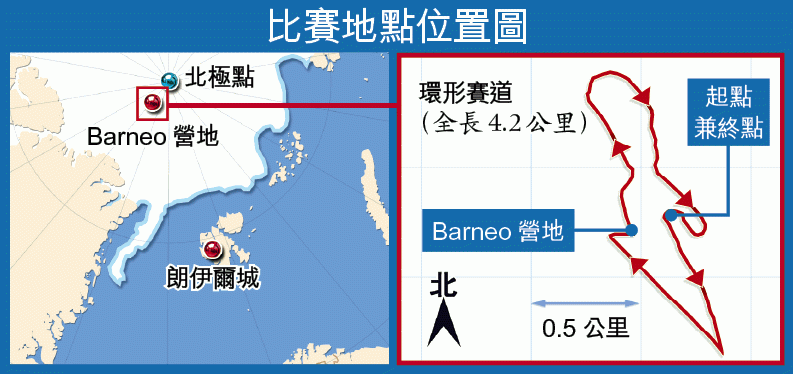 但一切仍需「睇天做人」,行程因而編排得盡量緊密,免受天氣突變影響。昨日參賽者分乘兩班專機,從挪威朗伊爾城(Longyearbyen)直闖北緯89度的冰天雪地。所有參賽者一抵達後,恐防天氣有變,3小時內就會正式開賽。