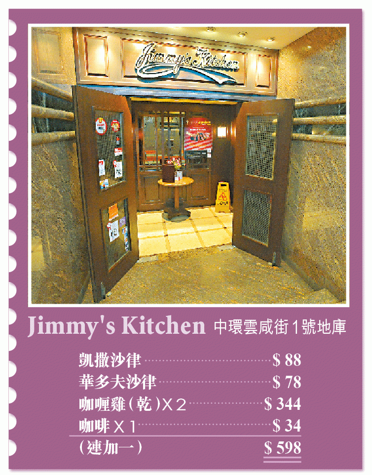 最理想的食飯地點是中環,本來我想找一個居高臨下的地方,但考慮到要兼顧訪問、吃飯和拍照,最後打消念頭。根據我對中環地理的認識,佔中最有效率方法,是佔領皇后大道中和畢打街交界,我想到最近這裏的餐廳是Jimmy's Kitchen。