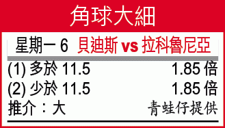 周一西甲獨腳戲,由貝迪斯主場對拉科魯尼亞,兩軍各有所需;貝迪斯要搶分爭歐洲賽資格,拉科則要搶分護級。以近況論,近5仗取4勝1和的拉科,有力延續不敗走勢,「讓球主客和」必取「客勝」。 (球賽編號:星期一6;now632台明日4:00am直播)
