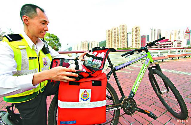 據知單車隊現時約有1,000多名隊員,每星期輪流出動,陳太有時會跟丈夫編在同一車更,雙劍合璧之餘,默契也比其他同事更好。「通常我哋嘅裝備大約重四至五公斤,包括消毒藥水、紗布、綳帶、敷料同三角巾,足夠應付日常嘅行動,巡邏嗰陣亦係以輕裝為主,太笨重會影響自身安全。」陳永強說。