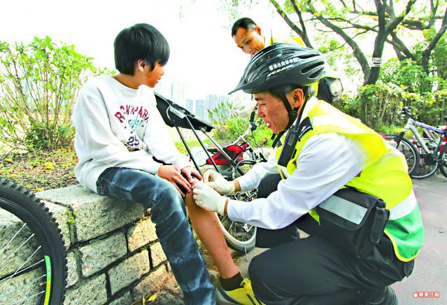 「我哋經常巡邏,發覺造成單車意外嘅不外乎幾個原因,包括初學單車嘅人、嬉戲、唔肯讓路、越線爬頭、冇戴安全設備,同埋冇留意路面嘅情況」。他表示,救護站正式提供服務時,會把綠底白色十字旗幟升起,以便市民求助。