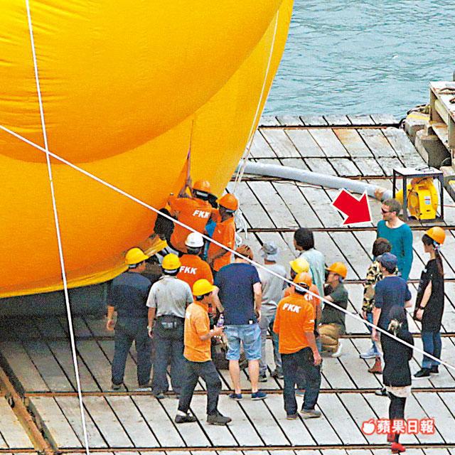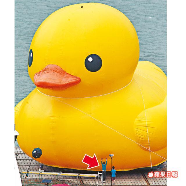 【本報訊】巨鴨熱潮停不了!暫時停泊在青衣船廠的Rubber Duck即將衝出青衣游到維港。逾百人趁星期日前往船廠一睹巨鴨風采,不論三歲定八十歲,無不被可愛巨鴨迷倒,高峯期有多達30人排隊上山坡。鴨爸爸霍夫曼(Florentijn Hofman)更首次現身船廠探望巨鴨,其間雙手輕按愛兒身軀,又為巨鴨洗白白,盼將最完全的巨鴨呈現在港人眼前。
