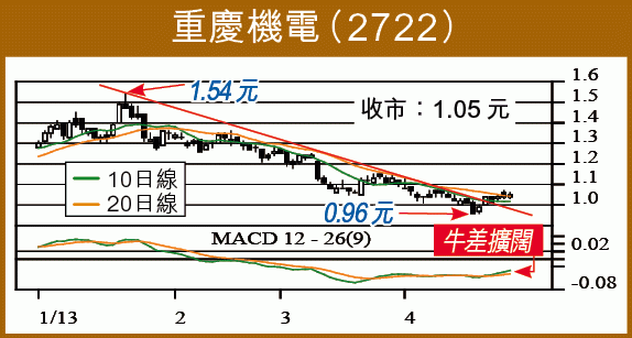 (2)同樣與內地汽車業息息相關的重慶機電(2722),今年有望炒復蘇,短期技術反彈可見1.32元,比上周收1.05元,升幅26%。