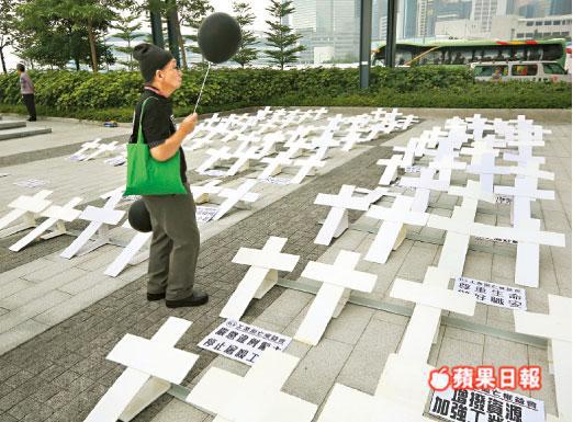 【本報訊】工業傷亡權益會趁昨日是國際工殤紀念日,發起遊行,要求政府保障工人職業安全,300名參加者來自各行各業,包括罷工碼頭工人,他們穿上黑衣,抵達政府總部後更齊齊躺在地上,寓意每年都有200人因工死亡,促政府正視。職工盟秘書長李卓人指,兩名葵涌貨櫃碼頭工人前晚發生工業意外受傷,令人關注工人經常超時工作會否構成危險。