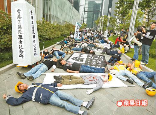 請願人士由灣仔修頓球場遊行至政府總部集會,各人為死於工業意外的工人默哀,然後集體躺下。工業傷亡權益會表示,本港每年逾7萬名工人因工受傷、染病或死亡,要求政府訂立工殤紀念日,肯定工人貢獻。李卓人指,碼頭工人罷工令資方強行要其他工人加班頂替,工人工時變得更長,要求碼頭營運商改善職業安全。