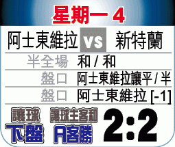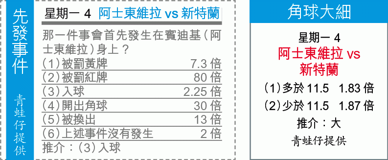 新特蘭換帥後表現明顯有改善,周一於英超護級大戰作客阿士東維拉,有力搶分而回,受讓平/半下盤可捧。 (球賽編號:星期一4;有線200及300台明日3:00am直播)