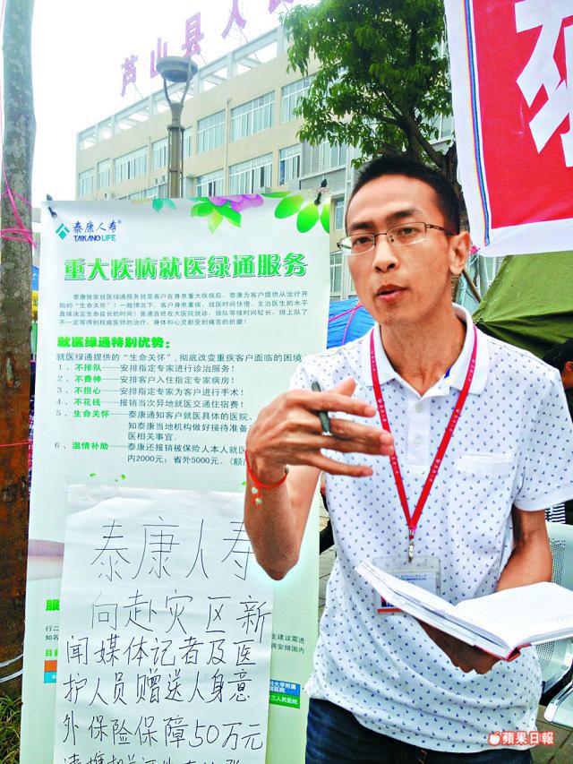 為了搞噱頭,公司更為記者和救援人員提供50萬元人壽保額的優惠服務,更透過手機短訊,或聯絡報章高層,游說記者購買。來自陝西的攝影記者趙晨,便從離開寶興縣到蘆山的路程上,收到短訊,然後馬上到諮詢點登記︰「我們進去寶興的路上,不斷見到有塌方,更知道有同行因此遇難,感到採訪地震確實是有危險,就買個保險,醫療費呀甚麼的都有幫助。」