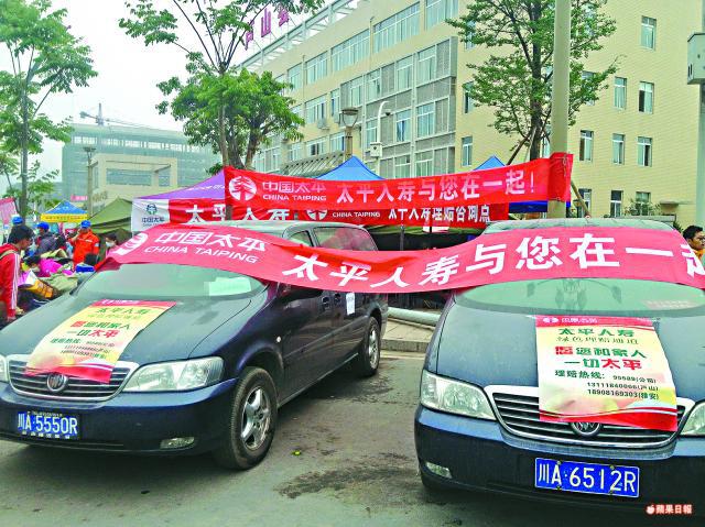 於地震震央蘆山縣的人民醫院附近,既是災民的安置中心,亦是醫療、物資派發的中心點,更是接載傷者進醫院的主要通道。在人民醫院的主要出入口,佈滿各家保險公司的「理賠點」,中國太平(966)旗下太平人壽除安置兩個帳篷外,更以兩輛私家車,佔用行車道,拉起橫額作宣傳。大量運送物資或救援車輛經過,也要馬上減速,幾經辛苦才拐過這宣傳點,令救援人員為之動氣。縱使「發國難財」的罵聲不斷,但駐點人員懶理,生意照做。另一方面,保險公司向災區捐款,亦被指為博宣傳(見另文)。