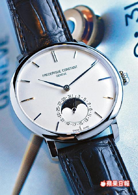 向來走時精確及合理價的瑞士品牌Frederique Constant,於今年展覽上推出首枚自家月相錶,搭載自行研發及生產的FC-705機芯,其錶面更是長青簡約款式,錶盤顏色更另有軍藍及銀色。