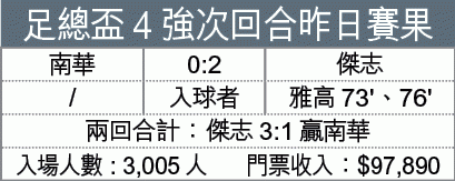 失意聯賽的傑志,昨在香港大球場對南華的足總盃準決賽大打爭氣波,贏南華2:0,兩回合計贏3:1,季內首次擊敗宿敵,下月11日與太陽飛馬爭盃;但傑志在足總盃決賽後3日便要作客踢亞協盃16強,令衞冕添隱憂。
