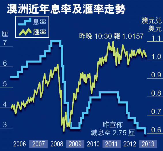 澳洲的息率過去一直較其他已發展的經濟體系為高,主要是為了吸引資金流入,以抵銷經常賬赤字。今次減息令澳洲與其他G7國家的息差收窄,削弱其息差優勢,拖累澳元兌美元昨一度跌0.98%,至1.0155在兩個月低位。