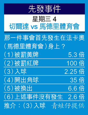 護級形勢危急,尾2的切爾達鬥志比天高!他們周三迎戰馬德里體育會,矢志搶分;馬體會雖然牌面較高,但聯賽第3位穩如泰山,戰意成疑,所以今仗力撐主隊爆冷,在受讓平/半之下,一於博下盤。(球賽編號:星期三4;now632台明日1:30am直播)