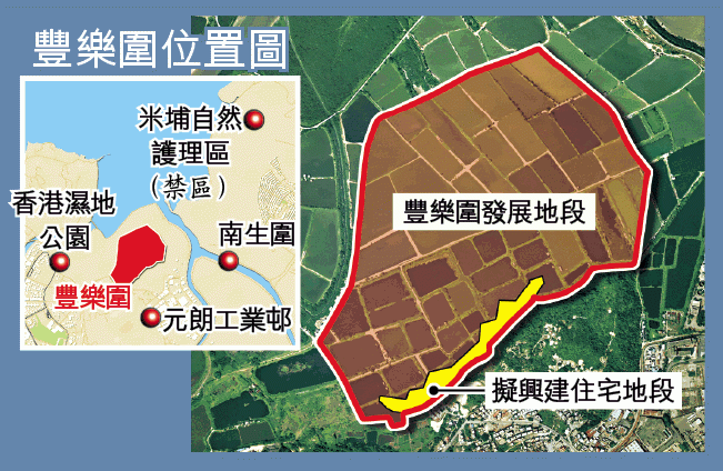 鄰近后海灣的元朗豐樂圍遍佈魚塘,是候鳥天堂米埔自然保育區的緩衝地帶。擁有豐樂圍大部份業權的長實,早於1992年已申請在該處發展,以子公司Mutual Luck Investment Limited作為發展項目的倡議人,並與世界自然基金會(香港)分會透過公私營界別合作模式,在發展以外保育濕地魚塘,但基金會與長實合作,一直為外界及其他環團詬病。