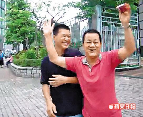 首被告鄭成榮(52歲)及次被告李克(51歲),昨獲輕判後面帶笑容離開法院,同行一名身穿紅色衫的男親友舉起雙手不斷跳,並說:「我好鍾意影相,都未上過鏡。真係爽!影相啦,上鏡呀!」隨後他更豎起拇指說:「影相啦,影我啦!」然後,他叼着香煙說:「我食煙呀影相吖!」