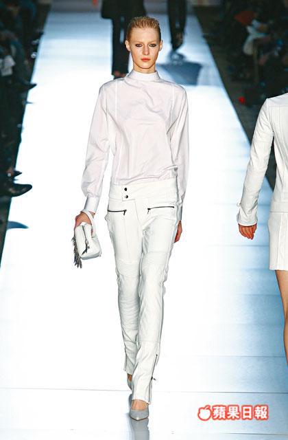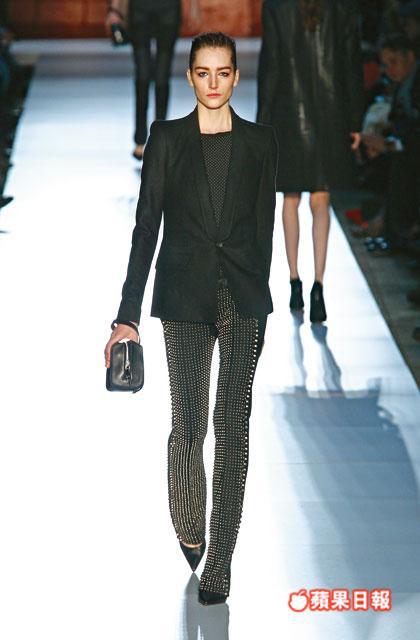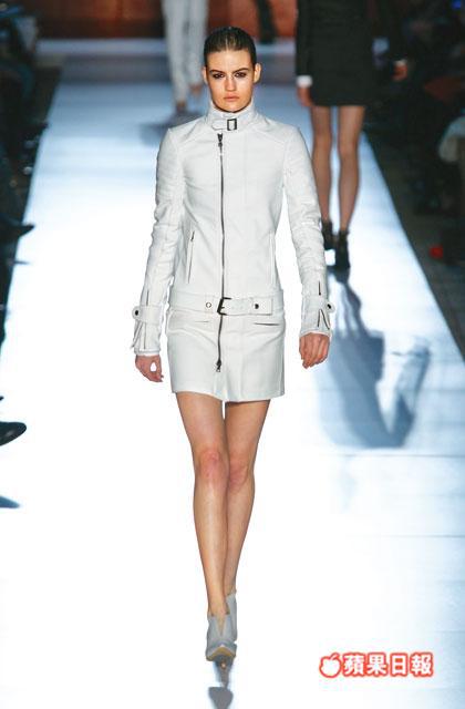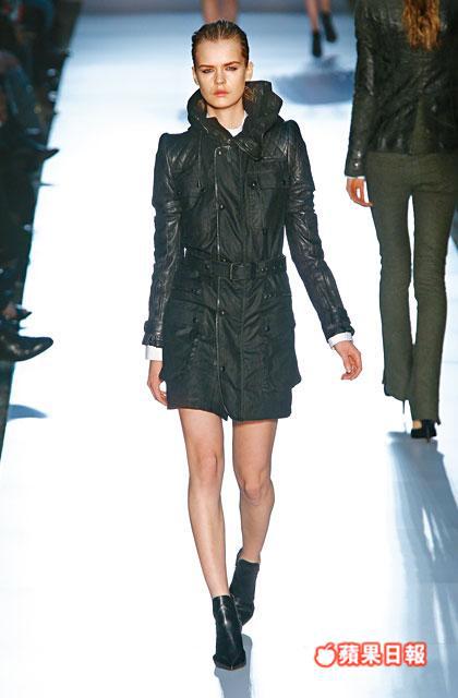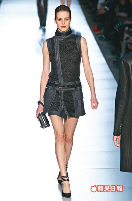整個系列深受biker fashion的影響,再以structural的手法處理,拼湊出一系列秋冬女裝。以象徵biker的denim和皮革為主幹,新裝有不少biker jacket的剪裁,包括飾有拉鏈細節的口袋和重型金屬鉚釘,連身mini dress的袖口亦加上zip和buckle等細節,增添masculine的狂野感覺。