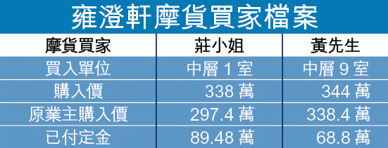 56歲任職的士司機李先生亦是一名摩貨買家,他以其妻名義購入11樓一單位,成交價344萬元,並已付68.8萬元定金。他與莊小姐抱同樣態度,若賣方悔約,要求賠雙倍定及其他損失,否則會如期在下月19日前完成交易。
