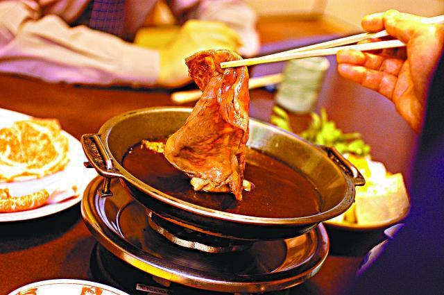 不太厚的鐵鍋傳熱極快,被牛脂肪滋潤過後,女侍應用木筷夾起一片又厚又柔軟的牛肉,用絲帶舞一樣的手勢翻動手腕,隱約見到牛表面略轉棕色,她就下一點老店按百年配方調配的醬汁,在侍應溫婉的翻動下,牛肉表面化作棕色又隱隱透着嫩紅,放到鮮黃的生蛋漿內就可吃了。