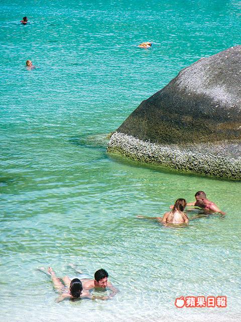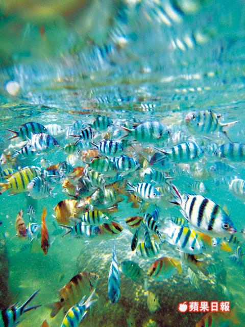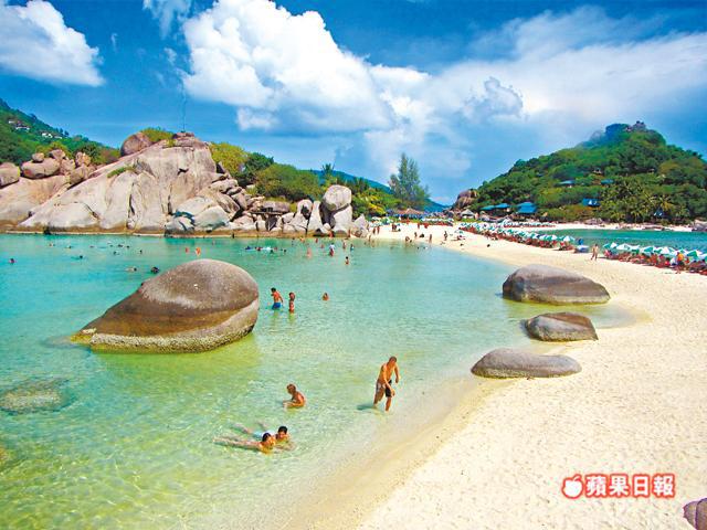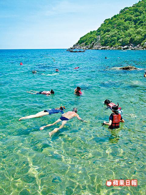 攻過頂,是時候浮潛直擊水底世界,距Koh Nang Yuan十分鐘船程的龜島(Koh Tao),以浮潛和潛水最有名氣,快艇駛近北端的Mango Bay淺灘,層層碧綠和透藍相間,一望已着迷,有即時跳進海底的衝動。帶上潛水鏡和吸管,俯身看見不夠三米深的珊瑚礁繁花似錦,原來是只有幾厘米高的軟珊瑚體管蟲石,外形如迷你鮑魚刷,五顏六色寄生在珊瑚礁上。由於海水清澈,能見度高,拋出麵包即引來數百條熱帶魚空群而出,上演一幕高清版的「魚樂無窮」;偶爾遇見不知名的魚群出巡,在身前身後自由自在地暢遊,彷彿自己也成為魚群的一分子。
