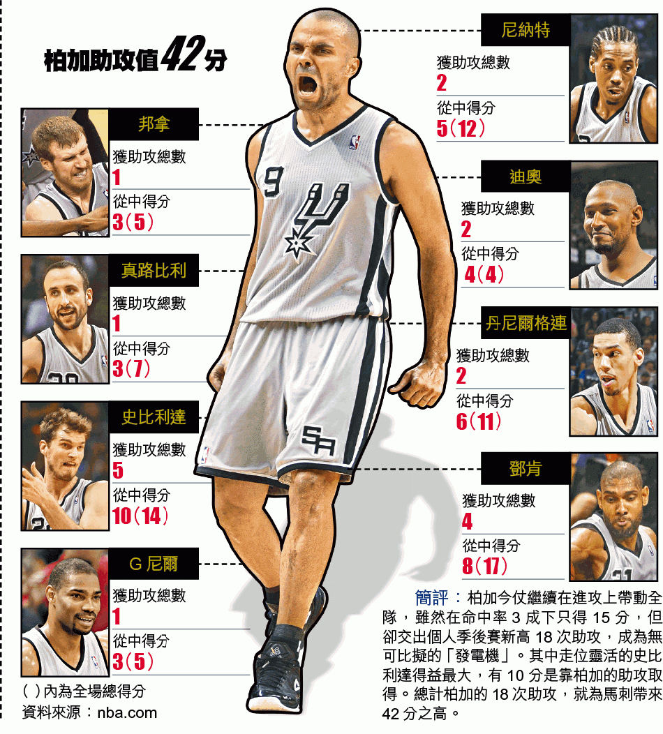 馬刺周二於主場再戰灰熊,憑柏加交出15分及個人季後賽最高18次助攻,並有老將鄧肯於加時連取6分,加時後以93:89力克灰熊。孟菲斯兵團現時以場數0:2落後,要打好周六的第3戰,保護主場才有望避免於西岸決賽出局。(now635台周日9:00am直播)