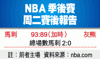 而灰熊教練賀連斯,就稱球隊要做好保護主場的工作:「我們再次面對(西岸首圈)對快艇落後兩場的情況,要好好地保護主場。今次更加不容易,但現時的狀況就是如此。」至於今仗錄有12分及14個籃板的灰熊中鋒馬克加素,就表示球隊下半場表現已有改善。他說:「馬刺很輕鬆地得分,可謂着火一樣。不過我想下半場己隊打出了自己的風格,當然一切事情在手感變順後,都變得好一點。」兩隊將移師孟菲斯,於灰熊主場FedEx論壇球場進行第3及第4戰。文:利司基