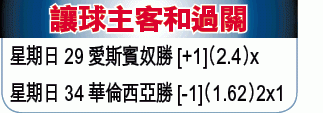 至於已經封王的巴塞隆拿就繼續踢風流波,作客愛斯賓奴(球賽編號:星期日29;now633台明日2:00am直播),不妨冷敲主隊愛奴[+1]「主勝」!巴塞有美斯及佩奧爾缺陣,而且他們近兩場贏波都是僅勝2:1,狀態未算太好。愛斯賓奴近況平平,但最近主場試過踢和皇馬1:1,可見鬥強隊時往往有打老虎的心態,踢高一班波。文:咖喱