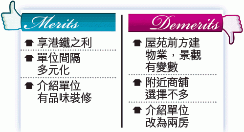 此單位裝修靚,但改動間隔後,僅適合講求空間感、希望住得舒服的兩口之家。至於家庭人數較多的買家,可能需要花錢還原間隔,因此單位叫價較平,開價1,030萬元,是同類尺碼入場版,呎價更低於入場版兩房海景戶。至於保留原裝四房間隔的數個放盤,叫價介乎1,100萬至1,200萬元,以連租約居多。