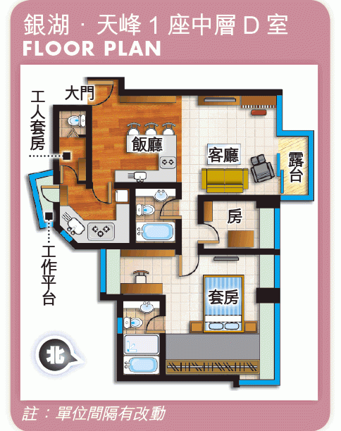 銀湖.天峰共有7座,間隔多元化,標準單位由兩房至四房,前排向海的單位,也有各類間隔可供選擇,但以三房以上居多。介紹的1座D室,建築1,319方呎,實用1,001方呎,原則為四房連套房,業主大刀闊斧將之改為兩房,將套房連同毗鄰兩個細房拆牆,變成巨型套房,令家具擺位更加鬆動,大床床尾騰出更闊通道。原則套廁旁的細房,則改成開放式工作間。餘下的唯一細房,則作娛樂房用途。