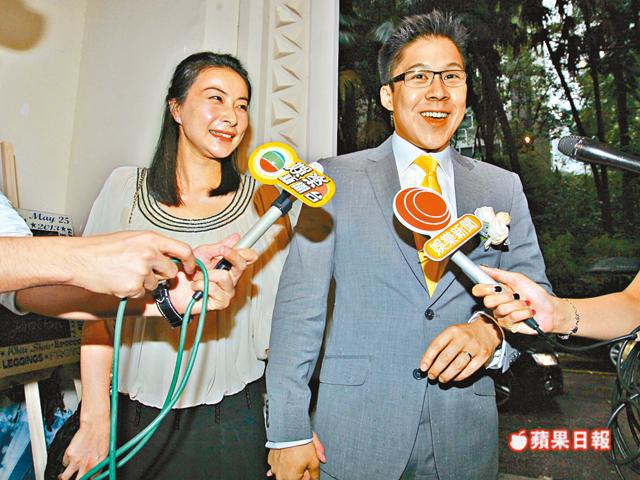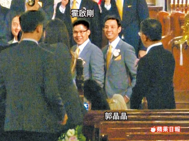 觀禮後,啟剛與晶晶十指緊扣上七人車,記者再上前問他們想生B仔定B女,及想順產還是開刀等問題,二人都笑笑口未有回答,其間啟剛更被攝影師的DV攝錄機扑親「中頭獎」,但他依然笑笑口,反叮囑對方小心,洋溢着做準爸爸的興奮之情。至於「霍老爺」霍震霆昨晚現身婚宴,記者告知啟剛已認喜訊及恭喜他做爺爺時,他即笑言:「係咩?」