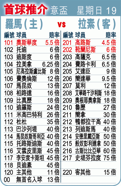 周日意大利盃決賽,由兩支首都球隊羅馬與拉素爭逐錦標,上演場地亦是兩隊的地頭奧林匹高球場。死對頭對壘,既為錦標,亦為下屆歐霸盃參賽席位,勢必打甩髀,要在90分鐘法定時間分出勝負不易;拉素受讓平/半,下盤可捧。(球賽編號:星期日19;now635台今日11:59pm直播)