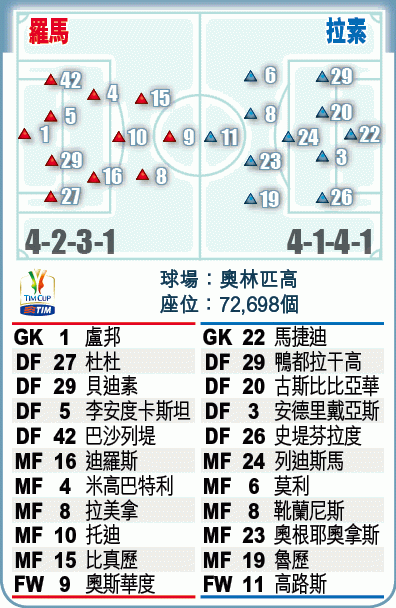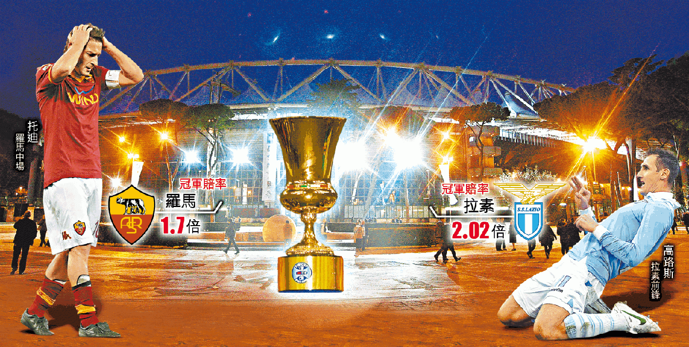 羅馬與拉素在今季意甲皆失望收場,前者在上周意甲煞科戰擊敗拿玻里,但仍只能以第6名完成球季,未能藉聯賽排名取得下屆歐戰參賽席位。拉素在意甲下半季戰績欠佳,雖在季尾回勇發力,但上周作客不敵卡利亞里後,同樣無法獲得歐霸盃入場券,變相令這個冠軍更重要。