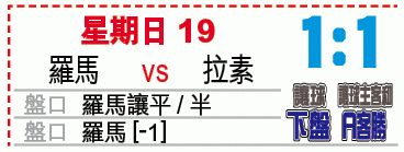拉素近年在首都打吡戰面對羅馬戰績全面佔優,近4次交手取得3勝1和佳績,今晚在奧林匹高球場再次交手,拉素在90分鐘法定時間坐和望贏,受讓平/半,下盤可敲。